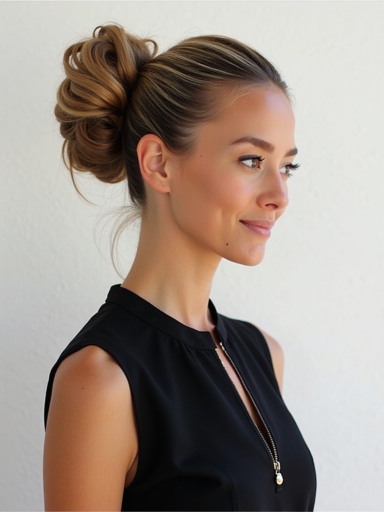 The top knot is a high-fashion, high-altitude option among Hair Styles for One Shoulder Dresses. By gathering all the hair at the very top of the crown, you create a vertical line that lengthens the entire silhouette. This is a brilliant One Shoulder Gown Hairstyle for petite women looking to add height. The top knot keeps the neckline entirely unobstructed, allowing the dramatic cut of the dress to be the star. It can be styled as a messy, voluminous bun for a relaxed, trendy look, or a tight, sleek knot for a ballerina-esque formality. This style draws the eye upward, lifting the face and emphasizing the cheekbones. It pairs exceptionally well with high-necked one-shoulder dresses where lower hairstyles might crowd the neck area. To secure a top knot for a long event, using a donut bun maker or teasing the hair before twisting can add the necessary structure. It is a bold choice that communicates a sense of fun and contemporary style, perfect for galas or fashion-centric parties.