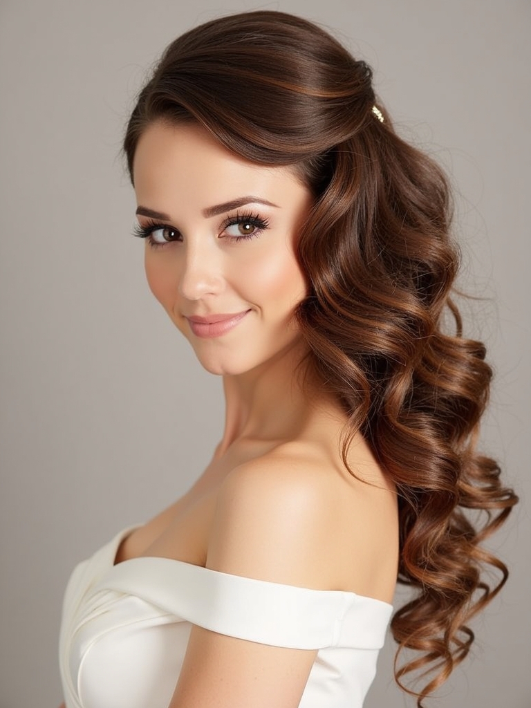 When looking for the most romantic Hair Styles for One Shoulder Dresses, side-swept curls often top the list because they create a perfect visual balance. The asymmetry of a one-shoulder neckline naturally draws the eye to the bare shoulder, and sweeping your curls to that opposite side or the bare side creates harmony. This look is particularly effective because it ensures your hair does not compete with the strap or sleeve details of your gown. To achieve this look, you should start with a deep side part, which helps direct the volume of your hair. Use a large barrel curling iron to create soft, cascading waves that sit elegantly on the shoulder. This is a quintessential One Shoulder Gown Hairstyle that works for weddings, galas, and red carpet events. It requires strong hold hairspray to ensure the hair stays to one side throughout the evening. If your dress has a dramatic ruffle or embellishment on the shoulder, sweeping the hair to the bare side prevents the look from becoming cluttered, allowing both the dress and the hair to shine independently yet cohesively.